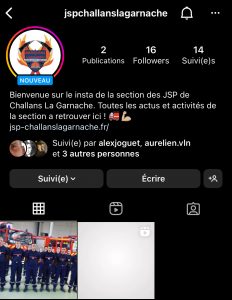 La Section JSP de Challans La Garnache déjà présente sur Facebook et depuis peu sur internet avec la création d’un site internet, a fait le choix d’ouvrir aujourd’hui son compte Instagram. Outils qui va nous permettre de communiquer sur nos activités sur le plan local. N’hésitez pas à nous rejoindre !